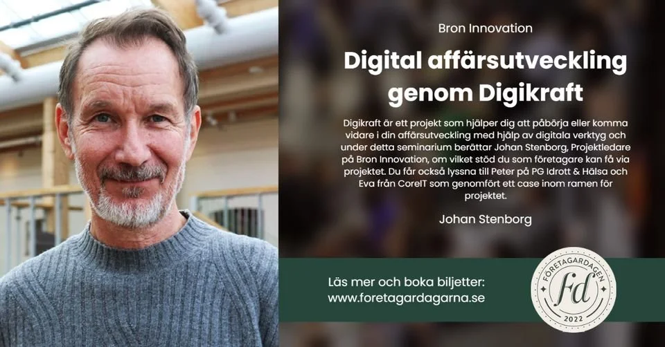 Under seminariet med Johan Stenborg, projektledare på Bron Innovation, kommer du få veta mer om Digikraft, ett projekt som hjälper dig att påbörja eller komma vidare i din affärsutveckling med hjälp av digitala verktyg. Johan kommer berätta mer om vilket stöd du som företagare kan få via projektet.