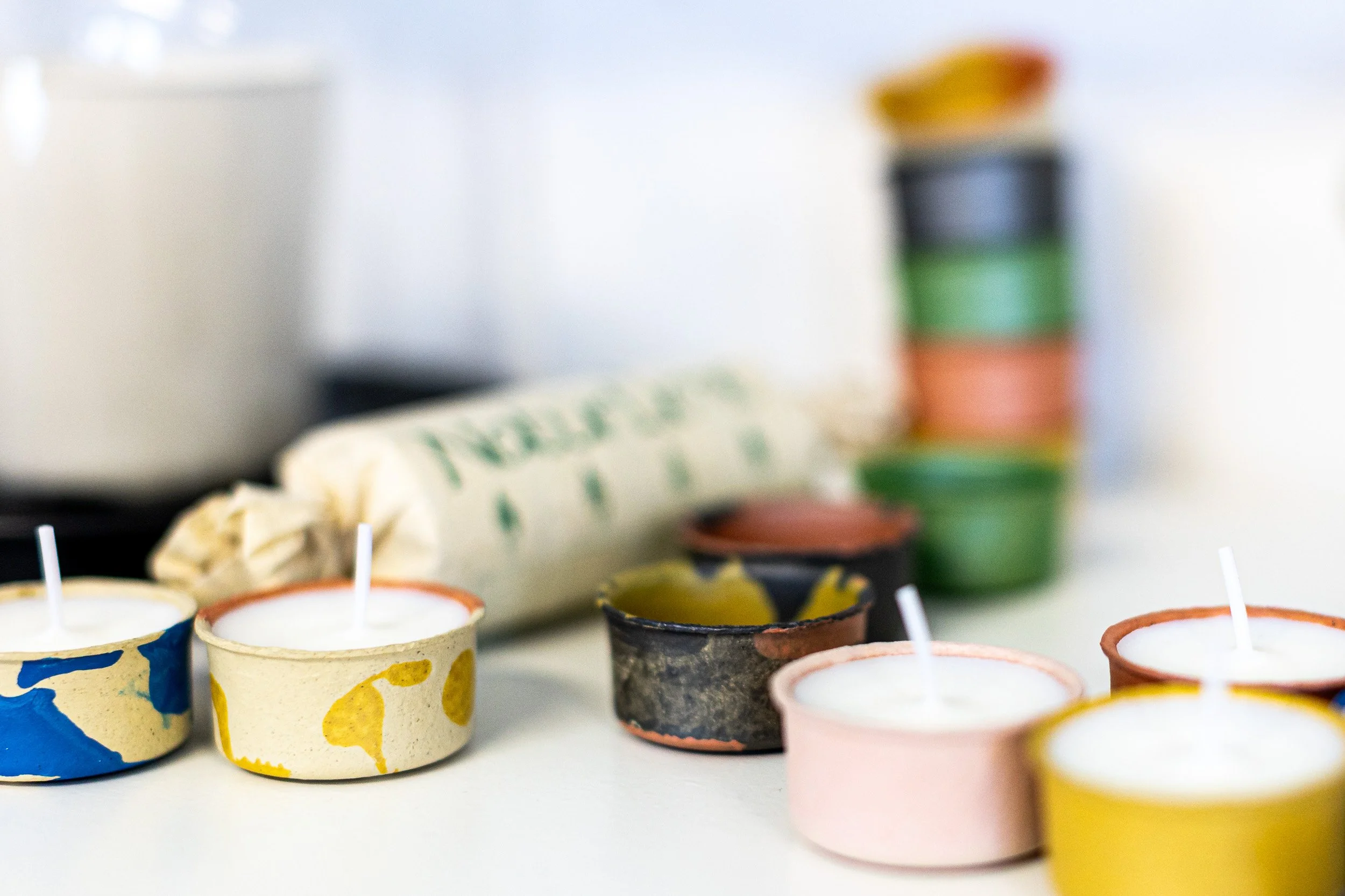 Jord Innovations värmeljus med hållare i förnybar fiber säljs bland annat på Smartasaker.se. De färgade hållarna på bilden är från en testkollektion, den verkliga produkten är ofärgad.